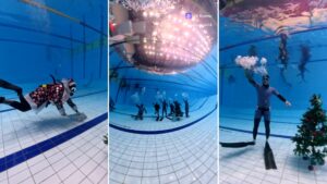 Необычное мероприятие прошло в бассейне. Этой традиции уже несколько лет. Правда, в этот раз ныряльщики решили пойти еще дальше. И провели новогоднюю елку не только под водой, но и в темноте. Видимо, для еще более загадочной атмосферы.
