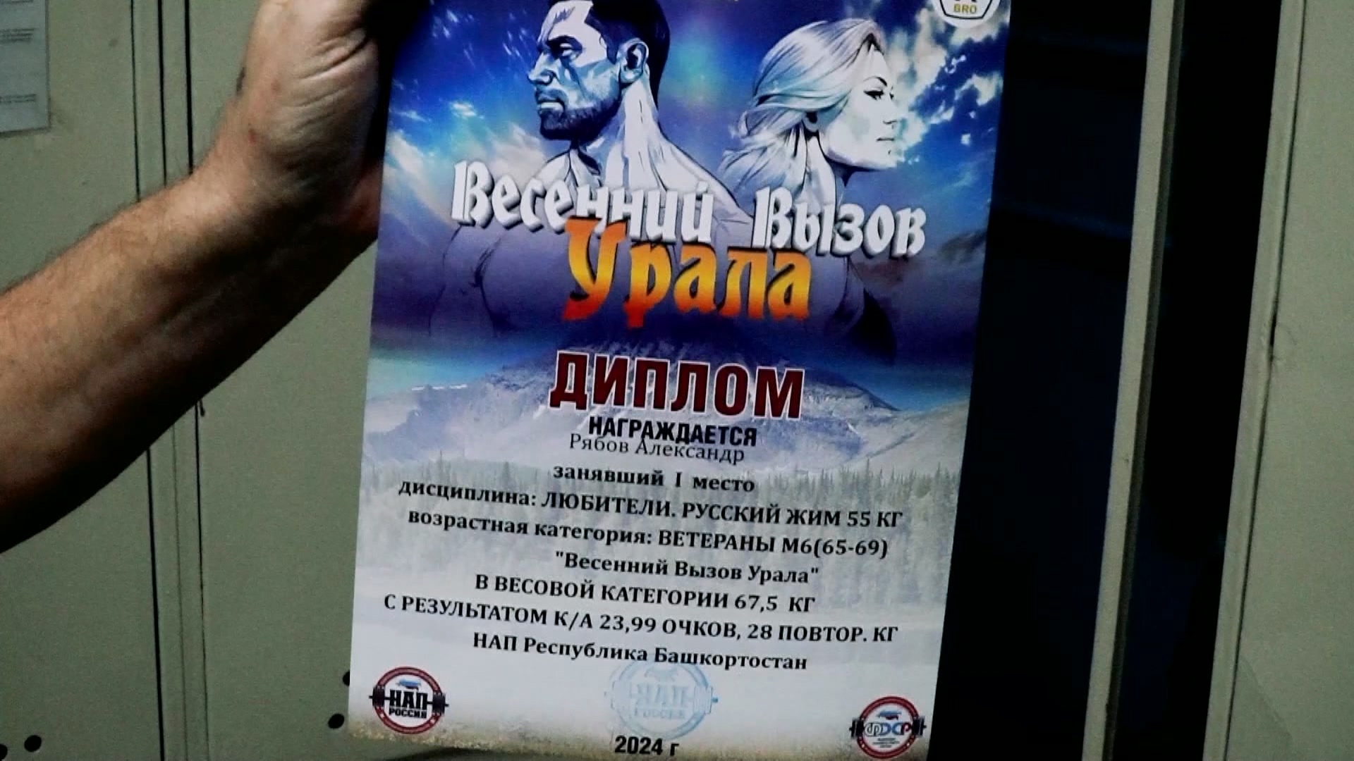 "Заявился на русский жим, 55 килограммов мой вес, сделал 29, один не засчитали, 28 раз поднятие, победил. Первое место в моём весе в моём возрасте, потом на следующий день пришло, что рекорд России", — рассказывает Александр Рябов, житель города Аша.