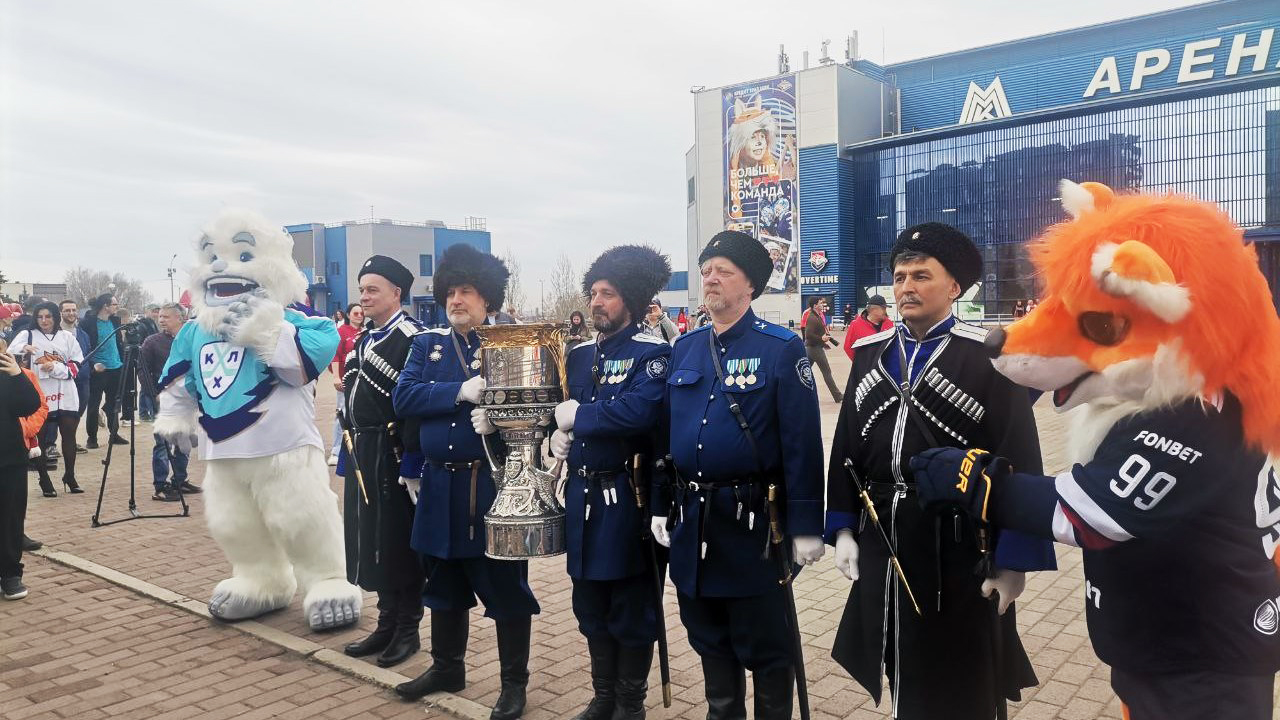Кубок Гагарина передали в надежные руки казаков и доставили в фойе арены. Кубок пока еще в нейтральном статусе, так что сфотографироваться могли и магнитогорские, и ярославские болельщики.