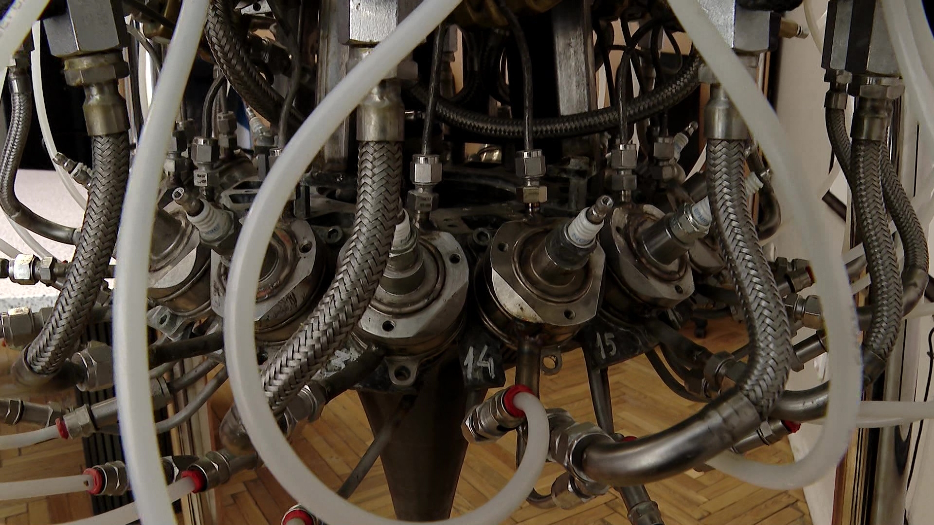 "Что имеется в конструкции? Основное – это сверхзвуковые демонстраторы камер сгорания. Их здесь 16 штук, которые расположены по кольцу. Данные струи продуктов сгорания создают тягу, которая помогает, скажем так, летательному аппарату подниматься в воздух и дальше в космос", – поясняет инженер-конструктор научной лаборатории "Двигательные и энергетические установки летательных аппаратов" Южно-Уральского государственного университета Алексей Шульц.
