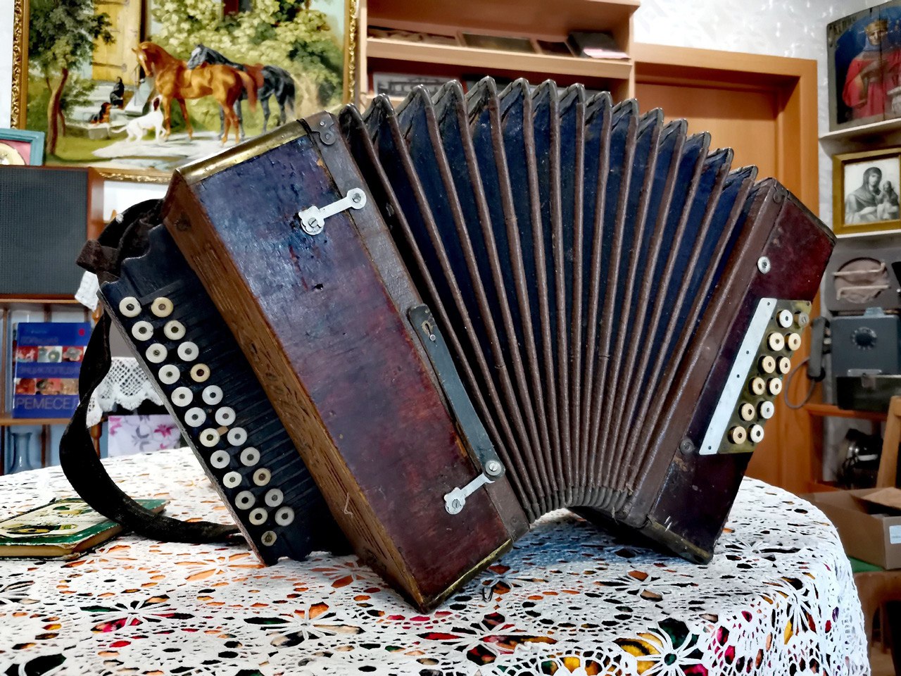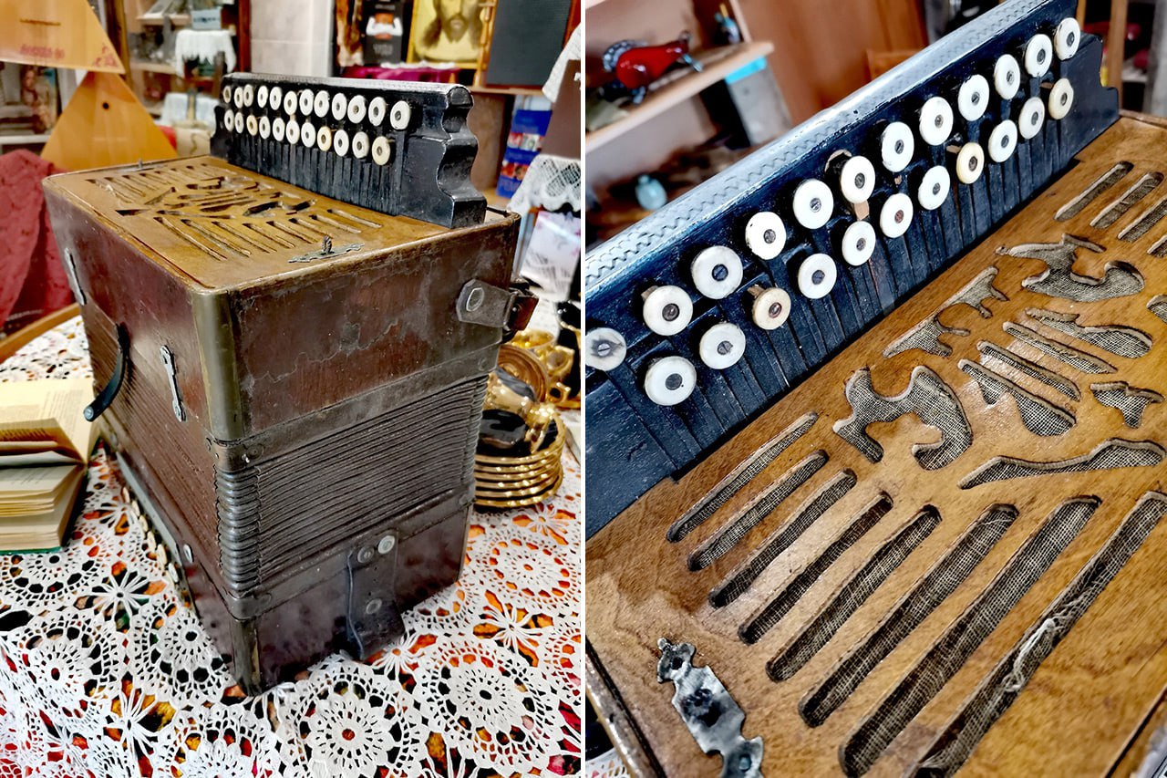 Музыкальный инструмент привезли из Каслей — его подарил Виталий Ершов. Многие годы хромка, или русская двухрядная ручная гармоника, принадлежала его деду Дмитрию Ивановичу. Появилась она у него в 30-х годах прошлого века.