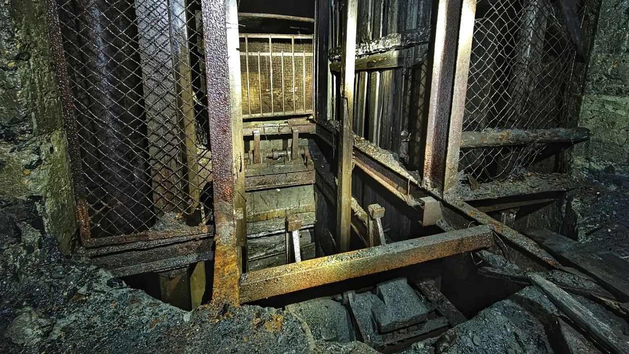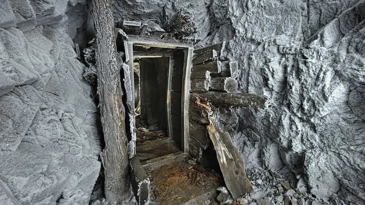 На фотографии попал заснеженный проход в подземелье, бывший рудный двор на горизонте, штольня, покрытое ржавчиной устройства для спуска и подъема выработки, а также растущие вверх огромные ледяные шипы — сталагмиты.