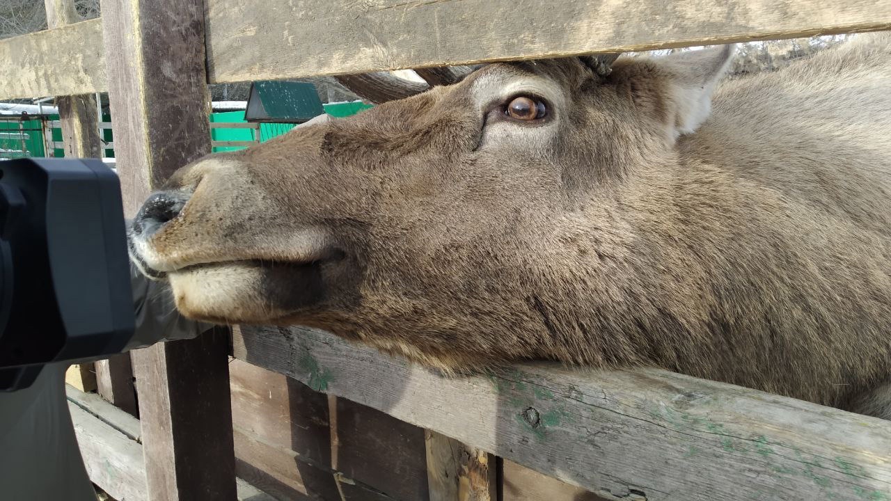 Алтайский марал Горыныч трётся массивными рогами об ограждение. Но сбросит он их только в апреле. А вот его соседи северные олени уже без рогов.