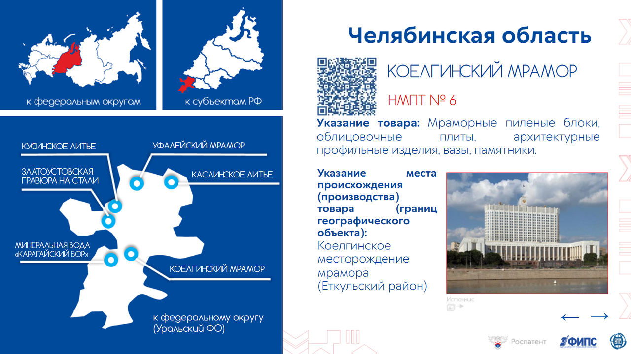 На интерактивной карте Роспатента Челябинская область представлена шестью брендами. На Южном Урале производят минеральную воду, которую добывают в Верхнеуральском районе, на Карагайском месторождении. Также регион славится каслинским литьем, уфалейским и коелгинским мрамором, златоустовской гравюрой на стали.