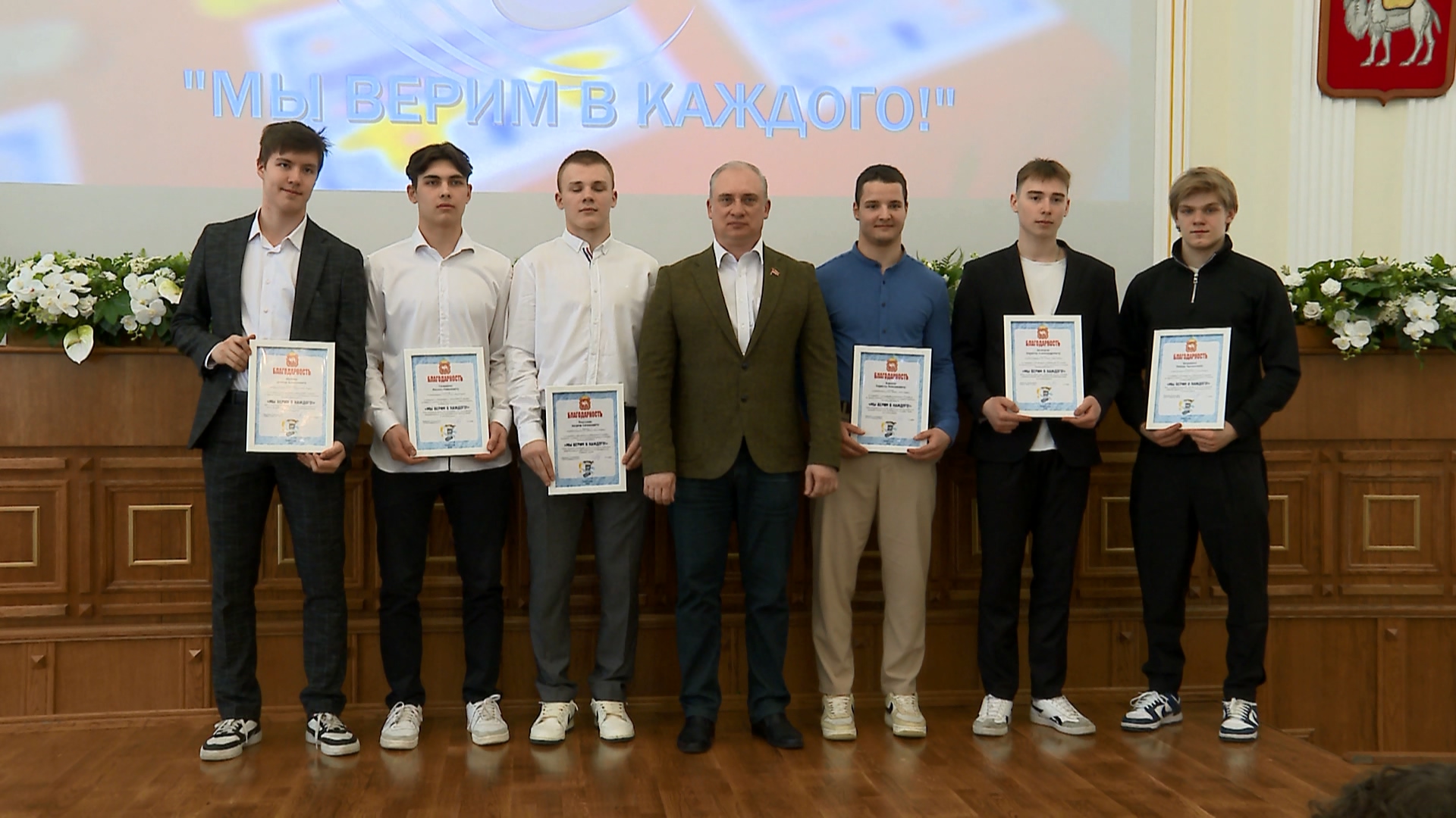За благодарностями выходят группами — это и спортивные чиновники, и социальные работники, и судьи турнира, волонтеры-студенты. Без клюшек на сцену поднимаются и хоккеисты из команды "Белые медведи". Они эффектно открывали состязания — боролись с победителями турнира "Мы верим в каждого!" прошлого года.