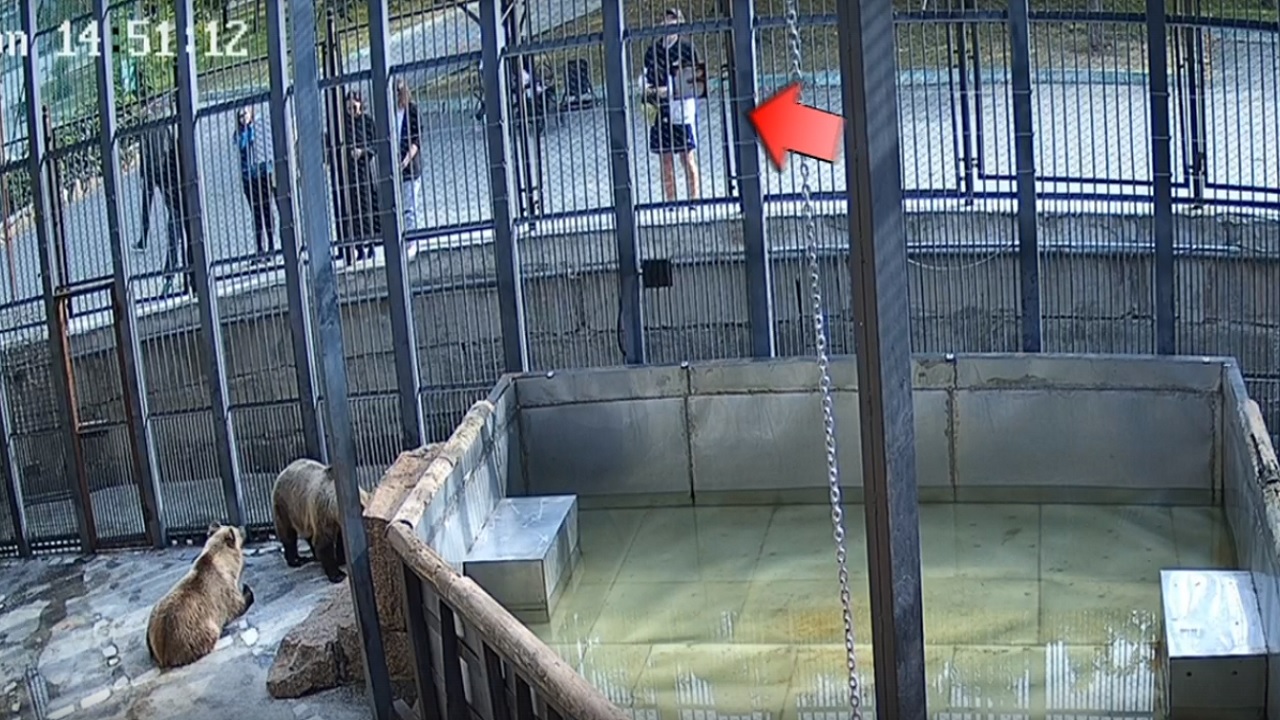 Он, в бейсболке, снят камерами, установленными в зверинце. Видно, что парень бросает что-то в клетку, это что-то падает в бассейн, и одна из медведиц достает еду из воды. Молодой человек улыбается и бросает снова.
