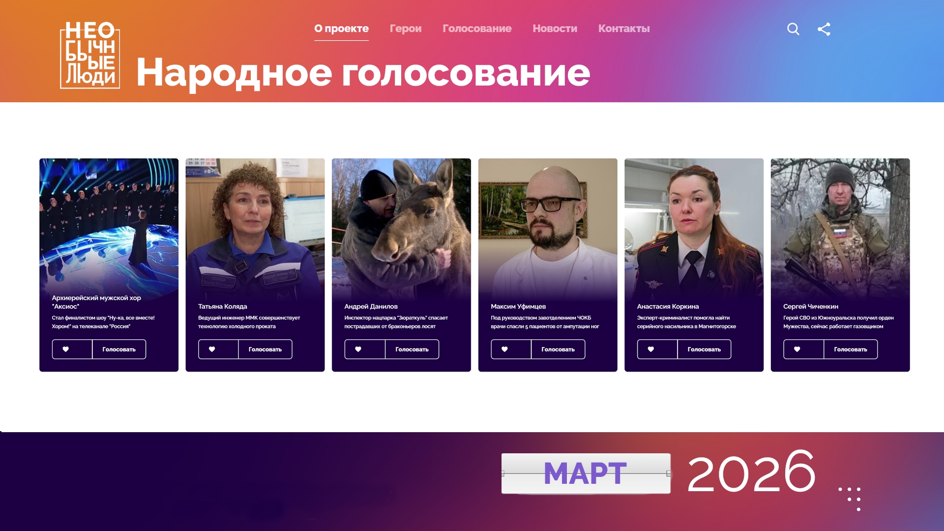 Они восхищают своим пением, мастерством криминалистики, защищают Родину, ежедневно спасают как людей, так и животных. Через несколько дней будут подведены итоги голосования за "Необычных людей" марта. Это проект с одноименным названием, который организует ГТРК "Южный Урал" совместно с компанией "Интерсвязь".