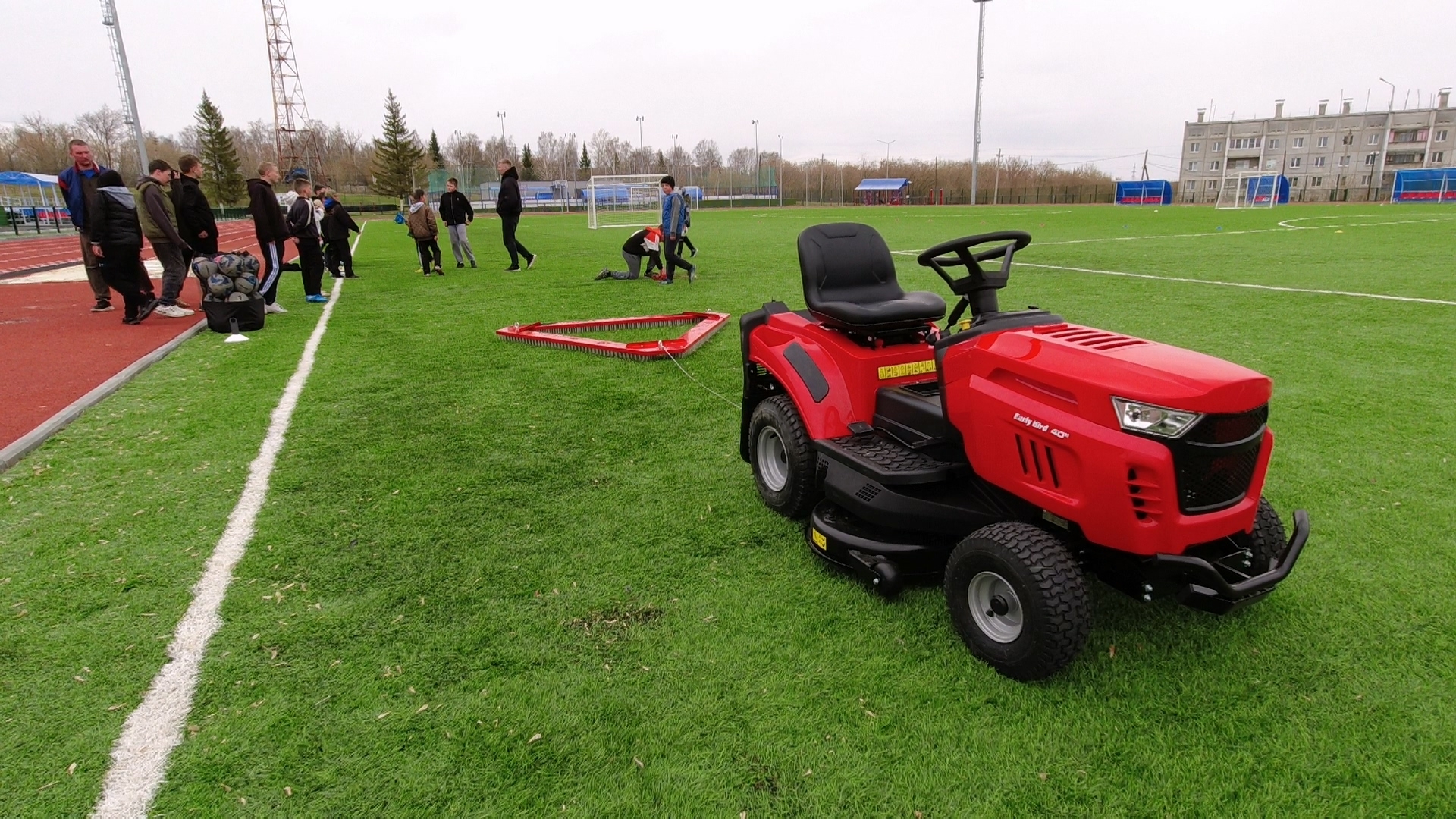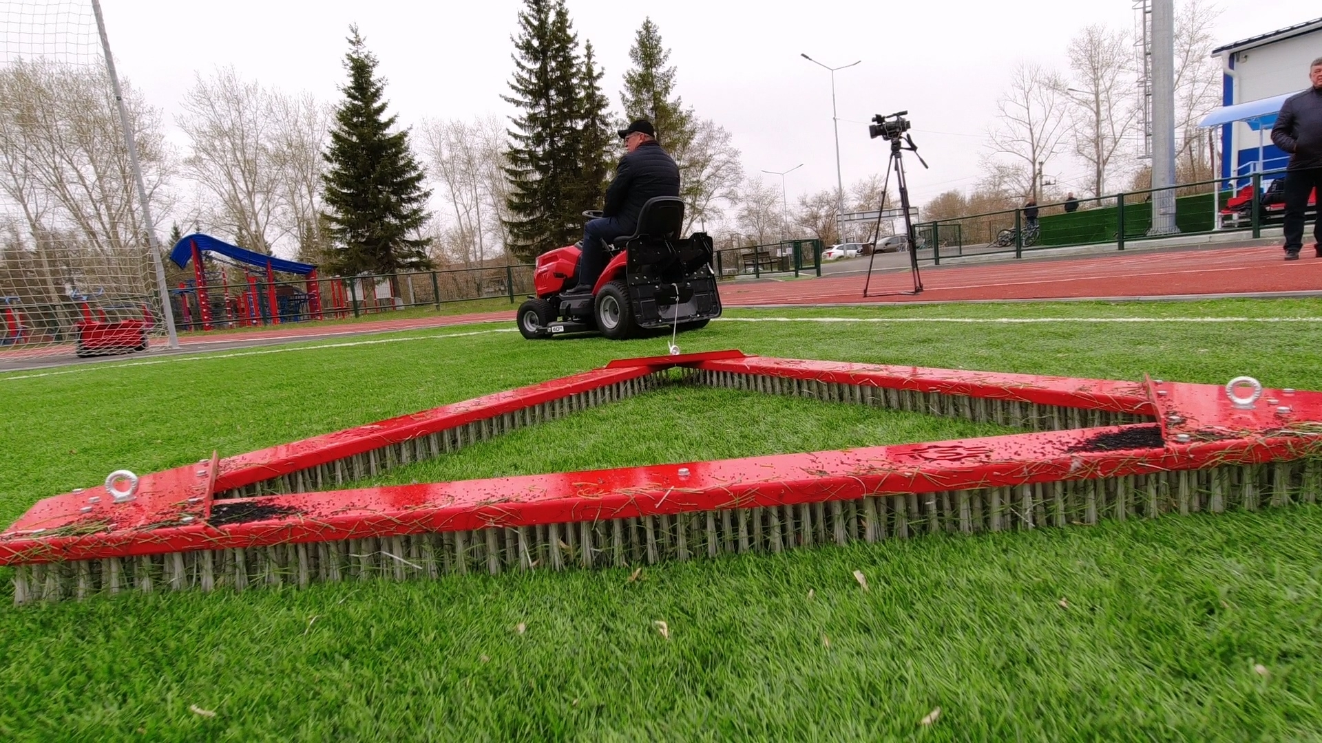 Красный юркий мини-трактор уже пробуют в деле. К нему прицепили специальную щетку, которая должна расчесывать искусственную траву, чтобы та не слеживалась и поле продолжало смягчать падения футболистов.