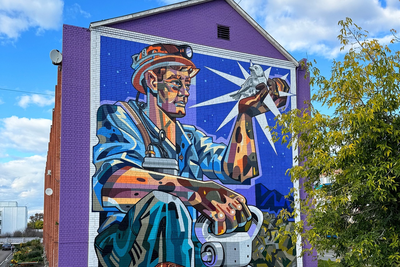 Автор рисунка – известный в граффити-среде художник Сергей Иман. На нем он изобразил шахтера сидящим на ящике после рабочей смены с отбойным молотком в одной руке и белой птицей, которая сияет, освещая все вокруг. Работу, украсившую фасад дома №40 на улице Октябрьской назвали "Свет, добытый из темноты".