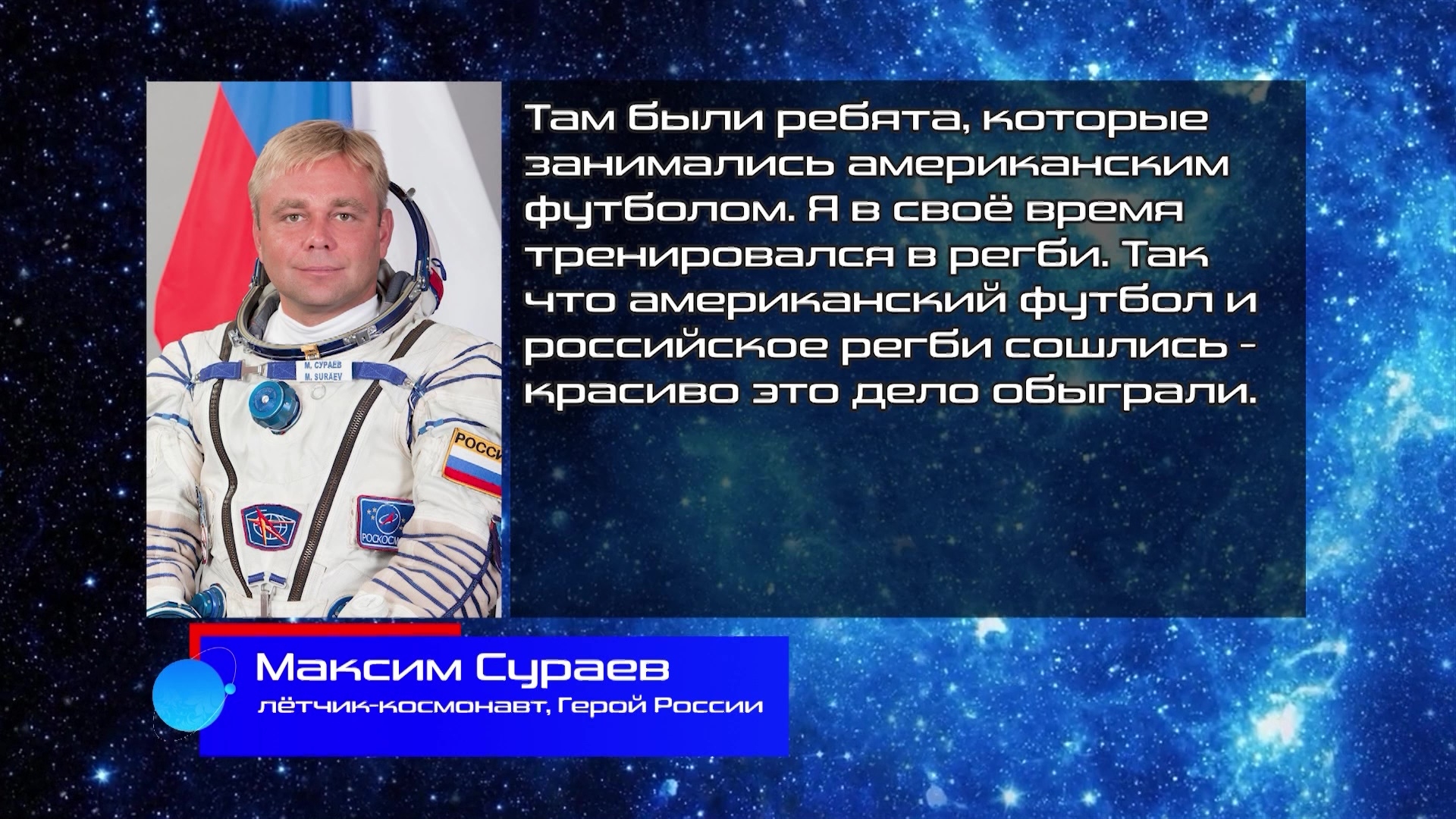 "Там были ребята, которые занимались американским футболом. Я в свое время тренировался в регби, так что американский футбол и российское регби сошлись. Красиво это дело обыграли", — вспоминает летчик-космонавт, Герой России Максим Сураев.
