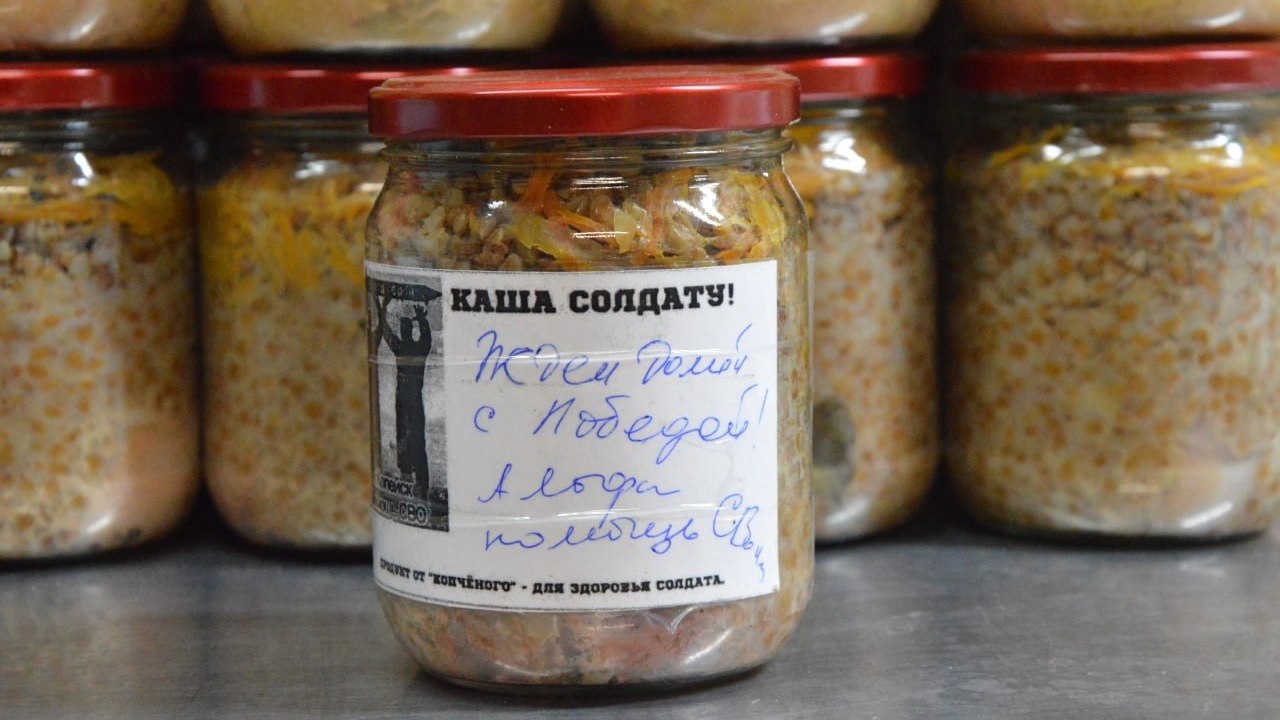 Мужчина организовал коптильню в гараже, а также установил автоклав для консервирования продуктов. Он делает для передовой копченое сало и мясо, каши с мясными добавками. На каждой банке написано: "Каша солдату. Продукт от Копченого – для здоровья солдата!".