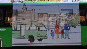 Школьники представили новый паттерн для челябинского автобуса. На эскизе изображен автобус на фоне главного корпуса ЮУрГУ. На первом плане – дружная семья, которая ждет на остановке транспорт. Проект представили на форуме "Транспорт большого города. Пассажирские перевозки. Дороги. Логистика".