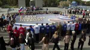 В честь дня рождения главы государства челябинцы развернули в центре города гигантскую открытку. В качестве подарка студенты, активисты, ветераны СВО, всего около трехсот человек, собрались возле памятника Курчатову и развернули баннер с надписью "С днем рождения, Первый!".