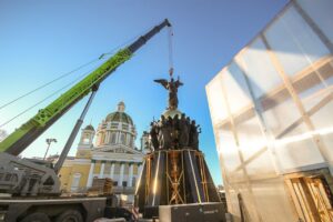 В Челябинске на монументе возле кафедрального собора Рождества Христова установили скульптуру архангела Михаила. На гигантский позолоченный шар водрузили главную фигуру предводителя небесного воинства.