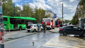 В центре Челябинска автобус совершил дорожно-транспортное происшествие и съехал в сквер. Инцидент произошел на пересечении проспекта Ленина и Свердловского проспекта.