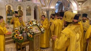 В кафедральный собор Рождества Христова накануне доставили частицу мощей святого князя Владимира. Сегодня там, как и во всех храмах России, прошла праздничная служба в честь Дня Крещения Руси.