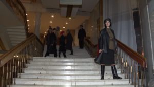 Мэтр привез свою постановку "Двенадцать". На сцене словно и не спектакль вовсе, а документальная лента. Эффект создает тонкая сетка, между зрителями и актерами.