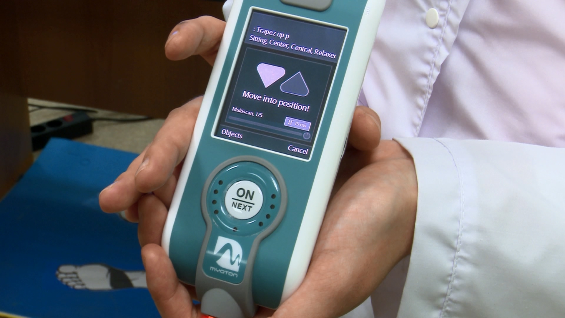 С помощью небольшого прибора — электромиометра — исследователь оценивает функциональное состояние мышц. Пять секунд и результат — на дисплее.