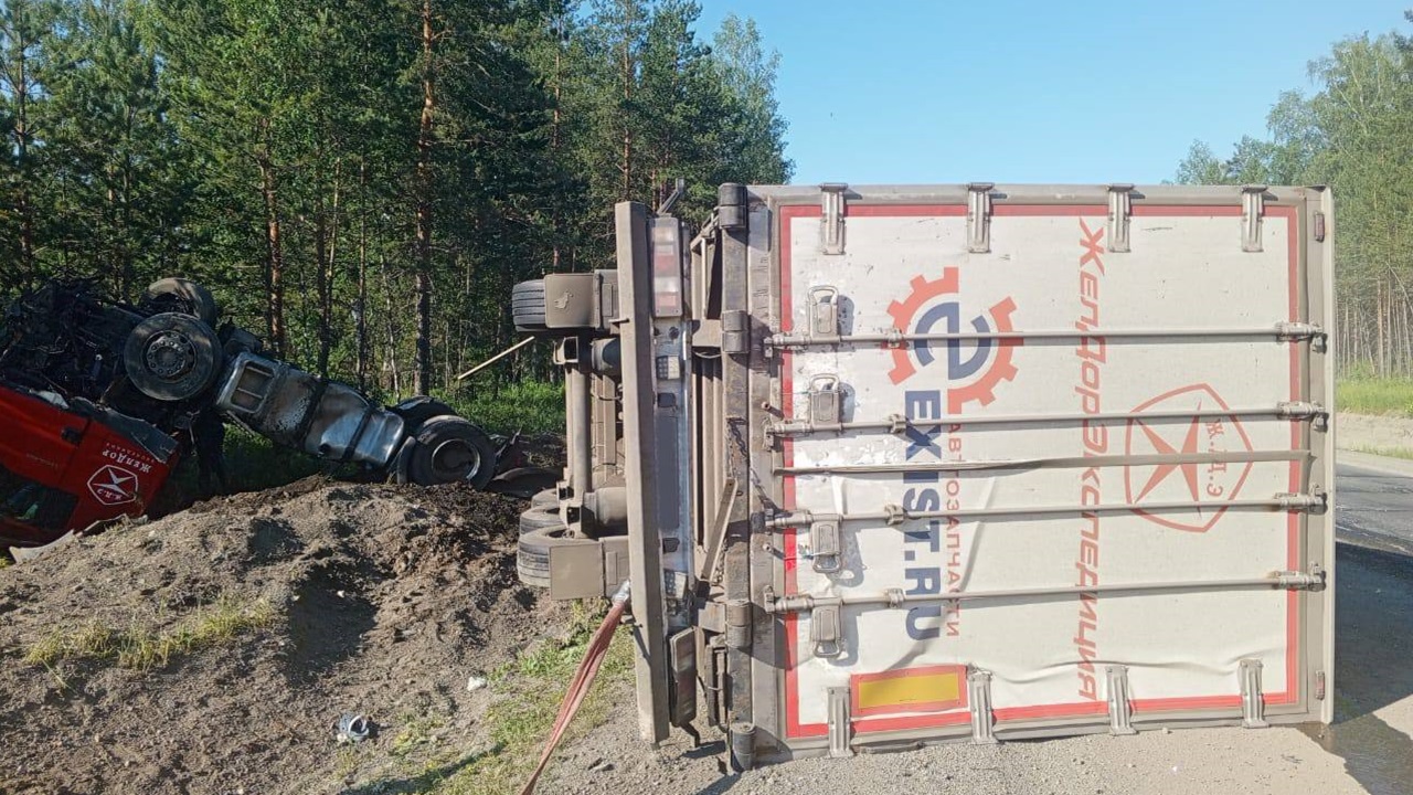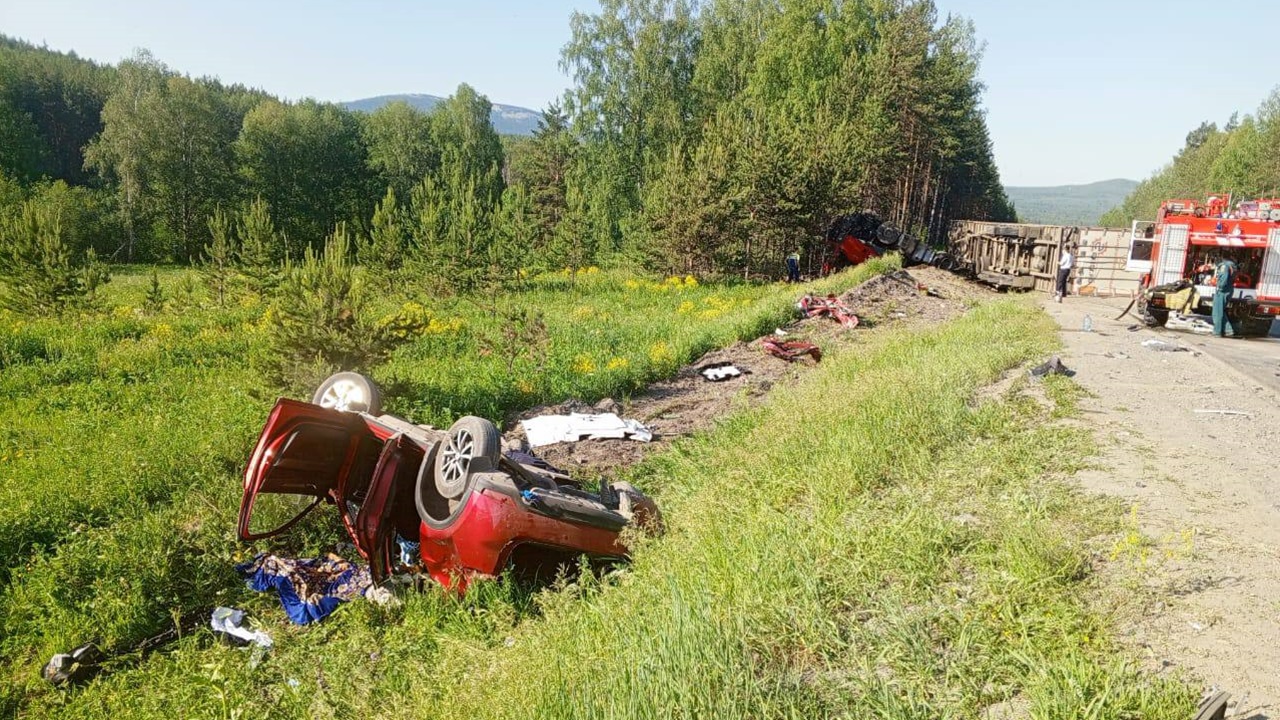 Инцидент произошел на 1689-м километре федеральной автодороги М5 "Урал" на территории Саткинского района утром в субботу, 15 июня. Около 07:15 большегруз MAN выехал на встречную полосу и врезался в иномарку Mazda CX-5. Тягач и легковой автомобиль перевернулись и вылетели в кювет, полуприцеп остался лежать на дороге.
