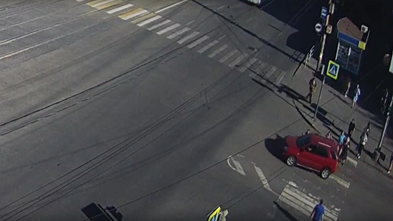 На перекрестке улиц Кирова и Калинина красный автомобиль сбивает пенсионерку, которая в этот момент пересекает дорогу. Момент аварии хорошо виден на замедленной съемке.