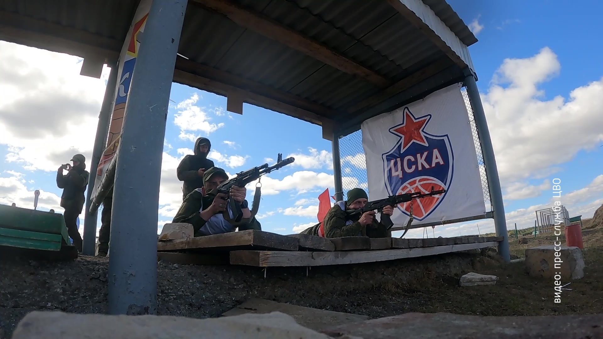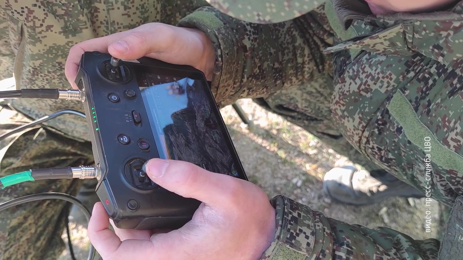 Окружной учебный центр ЦВО. Оператор запускает на высоту 50 метров FPV-дрон и "ведет" его к цели. Помогают ему в этом VR-очки, ноутбук и второй участник команды. Оба военнослужащих должны быстро пройти трассу, состоящую из нескольких элементов-препятствий.