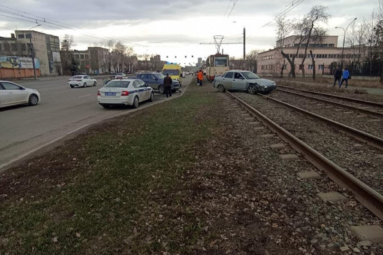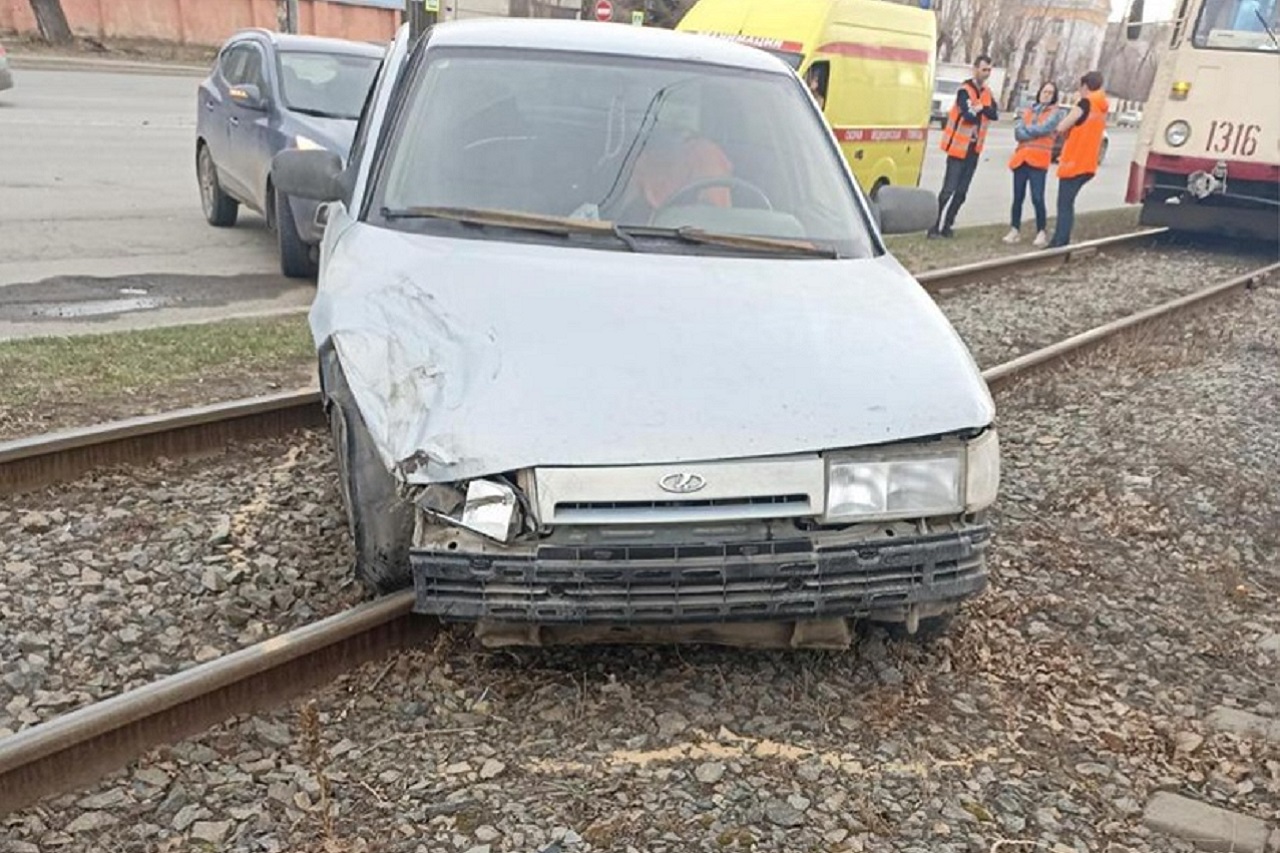 Серьезное ДТП в Челябинске. Отечественный седан в результате оказался на трамвайных путях.