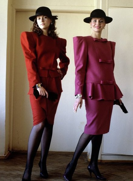 В 80-х женщины как никогда ранее стремились к независимости и успешной карьере, и в результате появилось целое направление – "Одежда для успеха", — неженственные костюмы, способствующие, как считалось, продвижению по служебной лестнице. В моду деловых женщин плотно входит жакет, он перекликается с мужскими формами 40-х годов, очень свободные плечи с подплечниками либо свободный квадратной формы, или же укороченный.